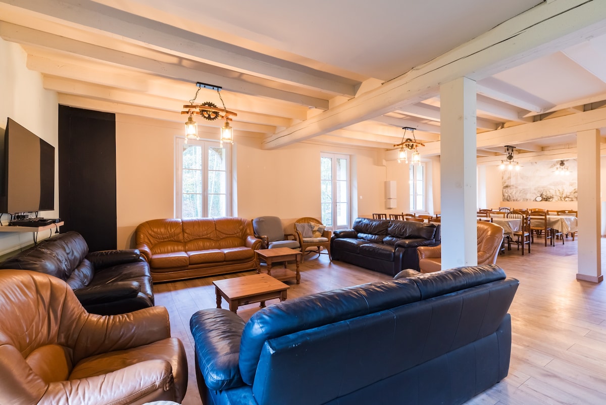- a large 70 m2 lounge/dining room with cable TV and 2 large tables for 10 people